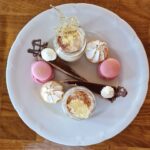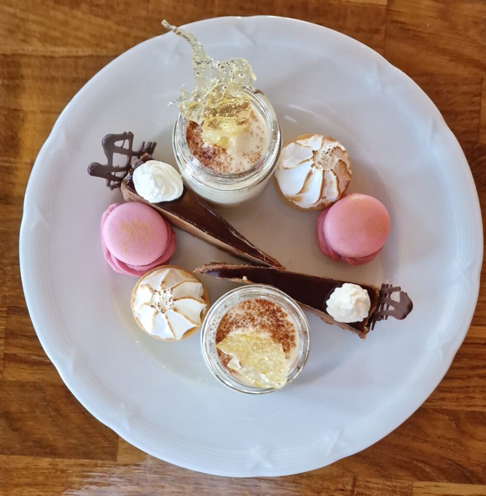 snittar, smarriga macarones, tårtbit samt olika tesorter och kaffe