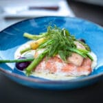 Dillpicklad sparris med dillsås, laxtartar, späda blad och sparrisoljedressing